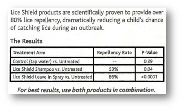 Don’t just take our word for it, the company said. “Scientific studies have shown that the use of Lice Shield Shampoo and Conditioner in 1 and Lice Shield Leave in Spray decreases the chance of lice infestation by over 80%.” Another ad included a statistical chart to underscore the “scientifically proven” point. (You'll remember from sophomore Stats class that "p-value" is a term related to the evaluation of whether test results are the product of cause-and-effect vs. random chance.)