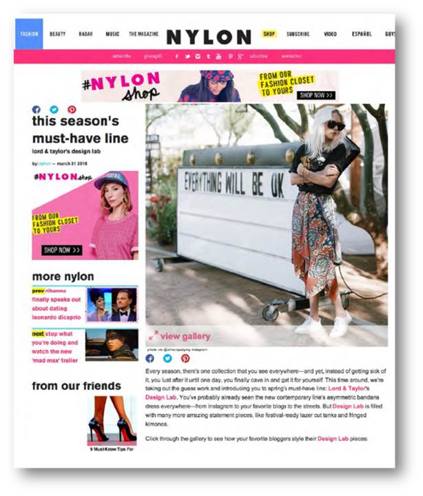 For the native advertising part of the campaign, Lord & Taylor signed a contract to have Nylon, an online fashion magazine, run an article about the Design Lab collection featuring a photo of the paisley dress. Lord & Taylor reviewed and approved the paid-for Nylon article, but didn’t require a disclosure about their commercial arrangement.