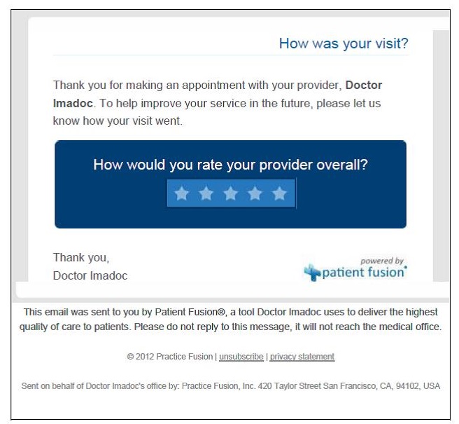Here’s what happened. After appointments with their doctors, patients received emails titled “How was your visit?” The message continued, “To help improve your service in the future, please let us know how your visit went” and included a link with rating stars. The message ended this way: