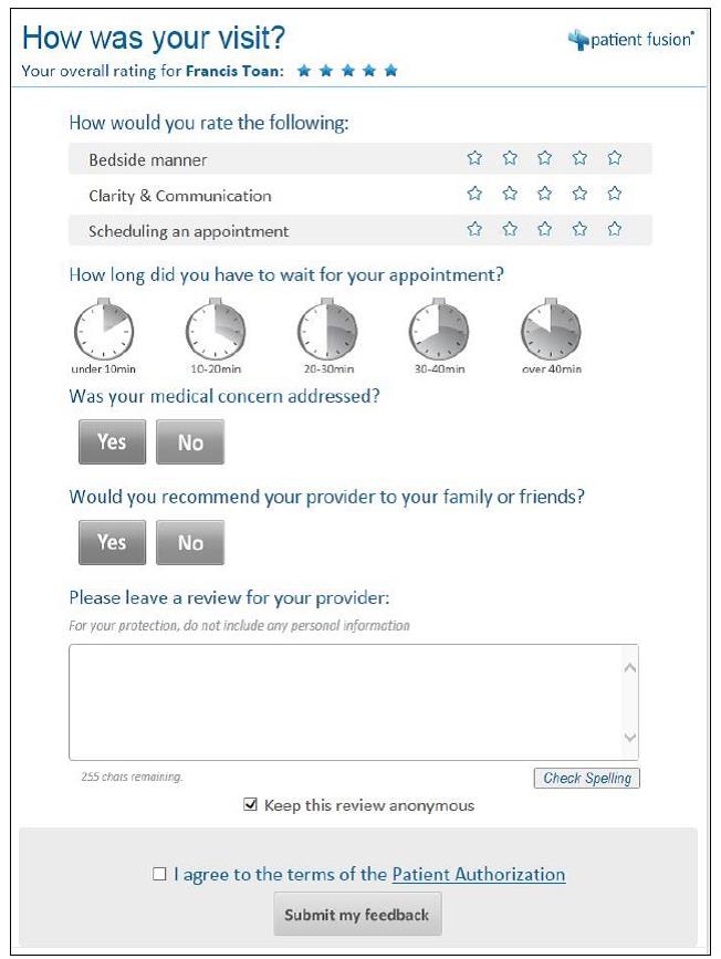 There also was a text box where patients were invited to “leave a review for your provider.” Below that was a pre-checked box with the phrase “Keep this review anonymous.”