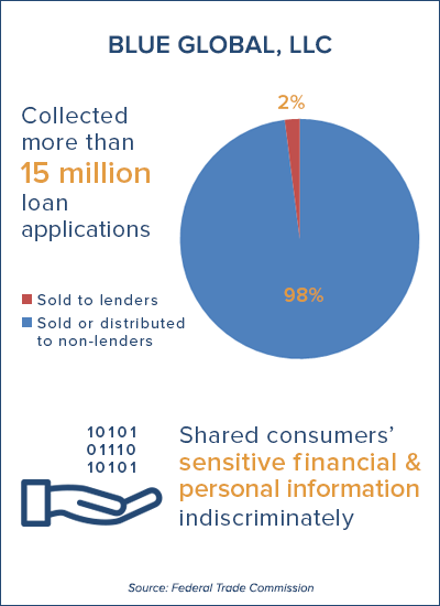 But according to the FTC, the defendants sold very few of the applications to actual lenders and didn’t match consumers and lenders based on loan rates or terms. In fact, the complaint charges that the company pretty much sold the leads – the data-laden loan applications – to the first buyer with a pulse willing to pay for them and without regard for how the buyer planned to use the treasure trove of confidential consumer information Blue Global was handing over.