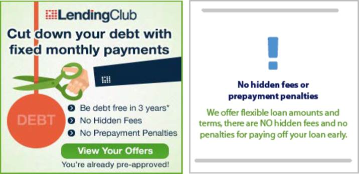 You’ll want to read the complaint and see the accompanying visuals to get a feel for what the transaction looks like from the consumer’s perspective. But the FTC alleges that on both computers and smartphones, what little information Lending Club offers about the up-front charge is hidden, often behind obscure hyperlinks or sandwiched between lines of “below the fold” text.