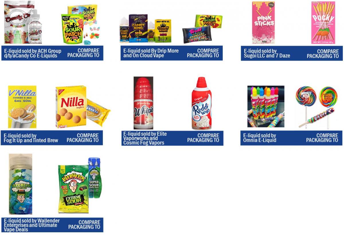 Each of the additional examples below shows the e-liquid on the left and the genuine kid-popular treat on the right. (It should go without saying – which is why we’re saying it – that the companies whose products were mimicked have nothing to with the marketing of the e-liquids.)