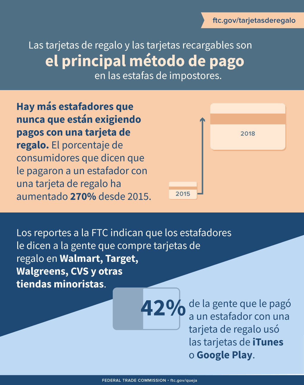 La primera edición de Datos Destacados se centra en una tendencia preocupante registrada en 2018: cada vez más, los estafadores están exigiendo que les paguen con tarjetas de regalo, en particular con las tarjetas iTunes y Google Play. La cantidad de reportes de consumidores que dijeron a la FTC que los estafadores les exigieron pagos con tarjetas de regalo o tarjetas recargables como MoneyPak, ha aumentado el 270 por ciento desde 2015. Actualmente, las tarjetas de regalo y las tarjetas recargables son el principal método de pago en las estafas de impostores.