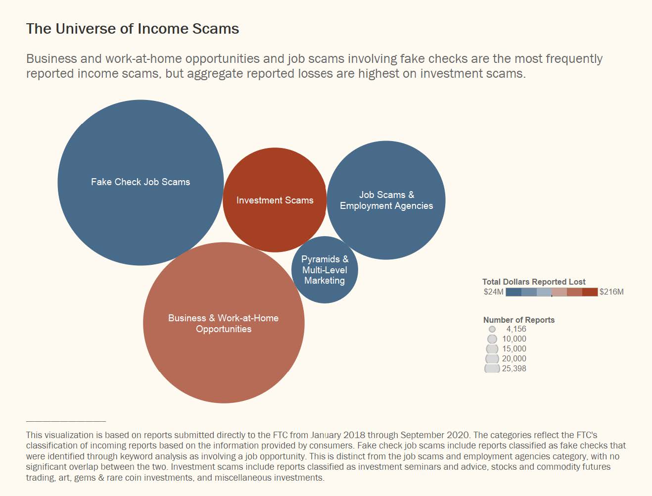 1 In Q2 2020, 11,879 income scams were reported, a 70% increase from reports captured in Q2 2019. In total, 29,419 income scams were reported directly to the FTC in 2020 through Q3, compared to 26,719 in all of 2019. These figures do not include the complaints collected by other organizations that contribute to Sentinel. Counting all reports to the FTC or any Sentinel data contributor, there were 44,274 income scam reports in 2020 through Q3 and 52,837 such reports in all of 2019. Income scams are defined in this Spotlight as frauds reported directly to the FTC classified as business and work-at-home opportunities, job scams and employment agencies, pyramids and multi-level marketing, investment seminars and advice, stocks and commodity futures trading, art, gems and rare coin investments, and miscellaneous investments. Additionally, reports about fake check scams that were identified through a keyword analysis as involving a job or other income opportunity are included.
