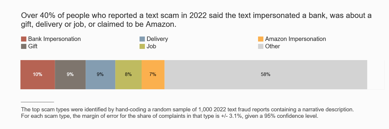 [4] The top scam types were identified by hand-coding a random sample of 1,000 2022 text fraud reports containing a narrative description. For each scam type, the margin of error for the share of complaints in that type is +/-3.1%, given a 95% confidence level. The scam types identified here do not replace the subcategories the FTC publishes on www.ftc.gov/exploredata, but rather provide more detail. The subcategories published on www.ftc.gov/exploredata primarily reflect topics consumers self-select on www.reportfraud.ftc.gov or report to the FTC call center or Sentinel data contributors. Reports on www.ftc.gov/exploredata may be tagged with multiple subcategories.