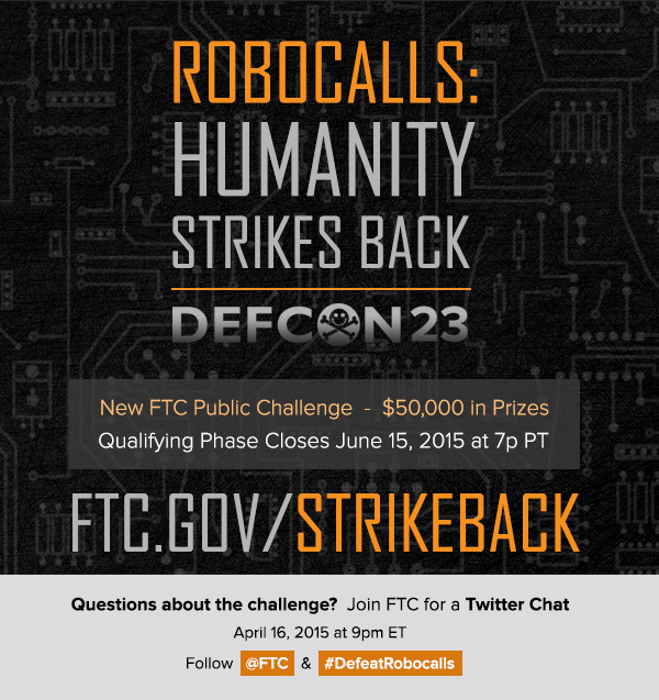 Have questions about the FTC’s challenges? Join our Twitter Chat to ask staff! Patty Hsue from the Bureau of Consumer Protection will be available for 60 minutes to answer your questions about DetectaRobo and Robocalls: Humanity Strikes Back.