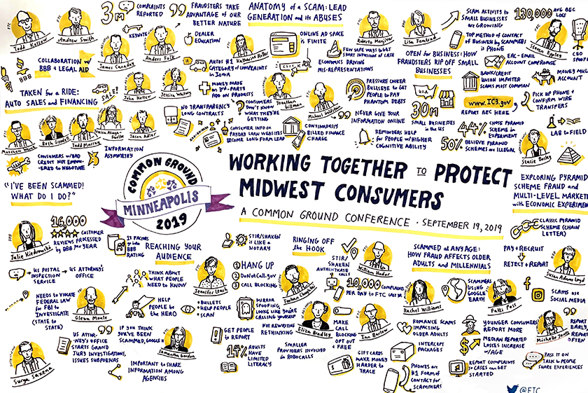 Join the Federal Trade Commission, Minnesota Attorney General’s Office, Better Business Bureau of Minnesota and North Dakota, Mid-Minnesota Legal Aid, legal services attorneys and other consumer advocates, and state and federal consumer protection officials at the 2019 Midwest Common Ground Conference to discuss a variety of issues facing consumers today. Learn about emerging trends and existing challenges. Explore ways to collaborate and share information and resources. Discuss recent consumer fraud trends with consumer fraud experts, including frauds impacting younger and older demographics, lead generation issues, robocalls, automobile finance issues, and other topics relevant to Midwest consumers.