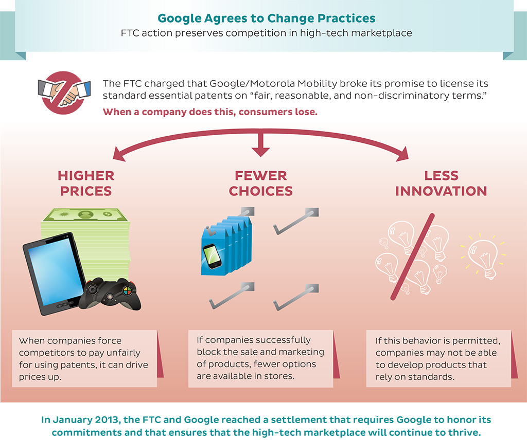 The FTC alleged that this type of patent hold-up is what the standard setting organizations sought to prevent by instituting FRAND licensing requirements. According to the FTC, if left unchecked, this type of patent hold-up can lead to higher prices, as companies may pay higher royalties for the use of Google’s patents because of the threat of an injunction, and then pass those higher prices on to consumers. This may cause companies in technology industries to abandon the standard-setting process and limit or forgo investment in new technologies, according to the agency.
