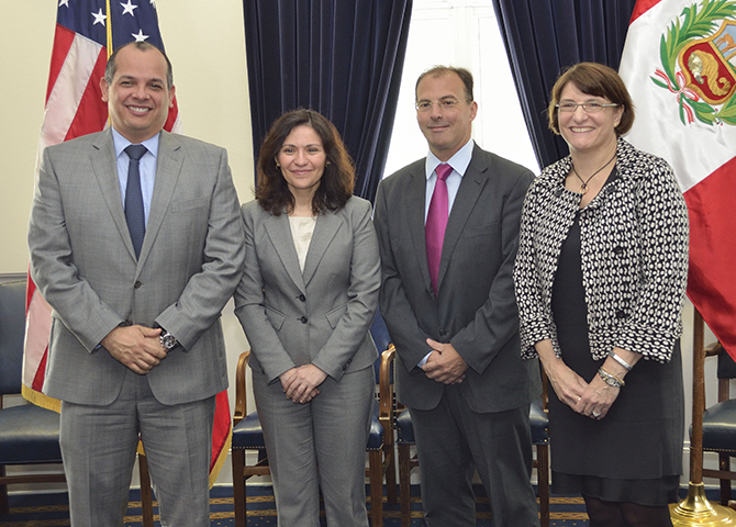Present for the signing the MOU were, from left: Luis Miguel Castilla, Ambassador of Peru to the United States; FTC Chairwoman Edith Ramirez, Chairman Hebert Tassano of INDECOPI, and Principal Deputy Assistant Attorney General Renata Hesse, head of the Justice Department’s Antitrust Division.