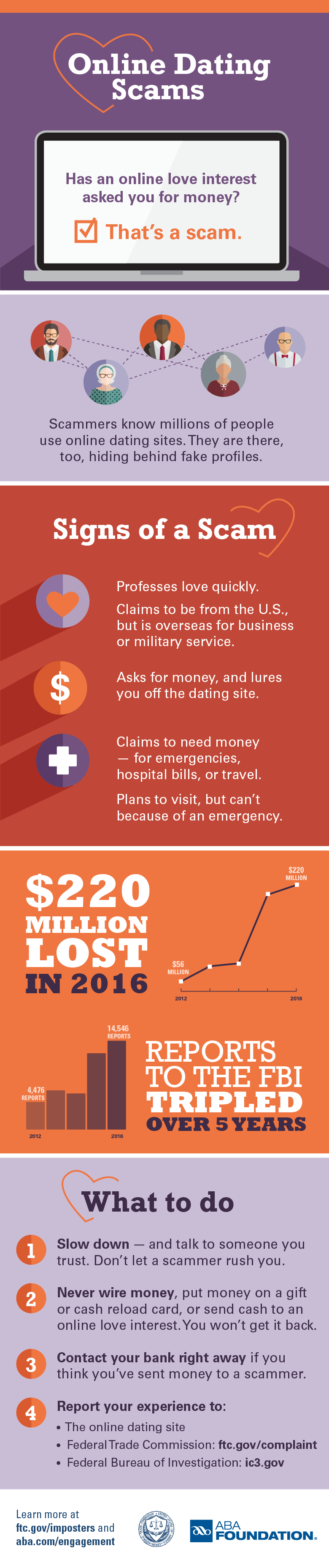 The FTC’s new infographic, developed with the American Bankers Association Foundation, lists common signs of online dating scams and how to handle them.
