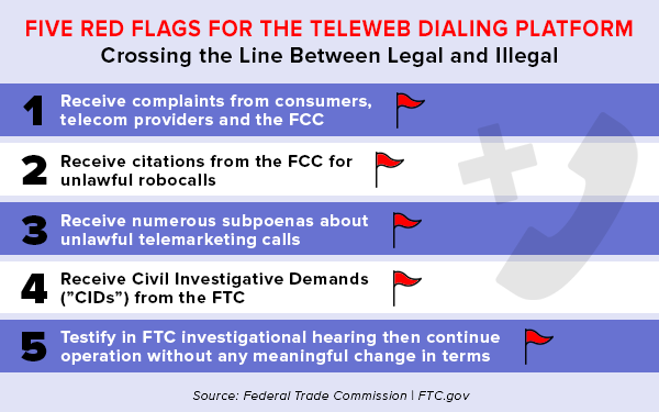 Based on this alleged conduct, the FTC charged Christiano, NetDotSolutions, and TeraMESH with assisting and facilitating: 1) illegal robocalls, 2) calls to number on the DNC Registry, 3) calls with spoofed caller IDs, and 4) abandoned calls, in which TelWeb hung up on consumers who answered.