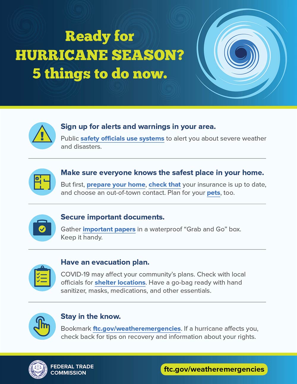 The Federal Trade Commission is alerting people to the importance of emergency preparedness with free resources, in English and Spanish, as the Atlantic hurricane season gets under way this month.