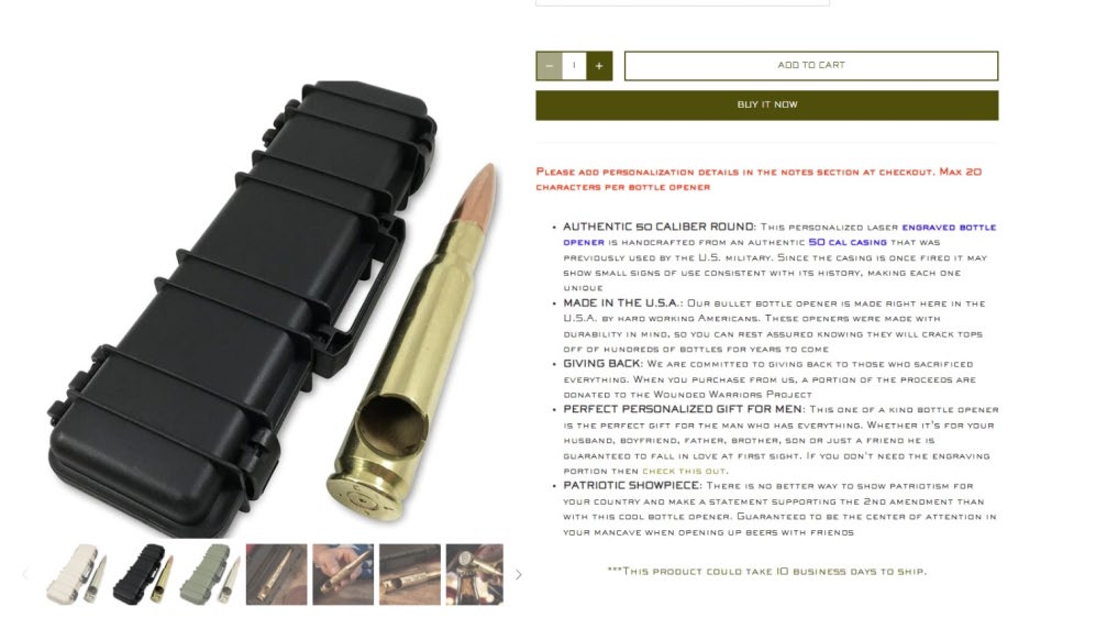 A product listing on the company’s website advertised an engraved 50 caliber casing bottle opener as being “Handcrafted from an authentic 50 cal casing that was previously used by the U.S. military.”
