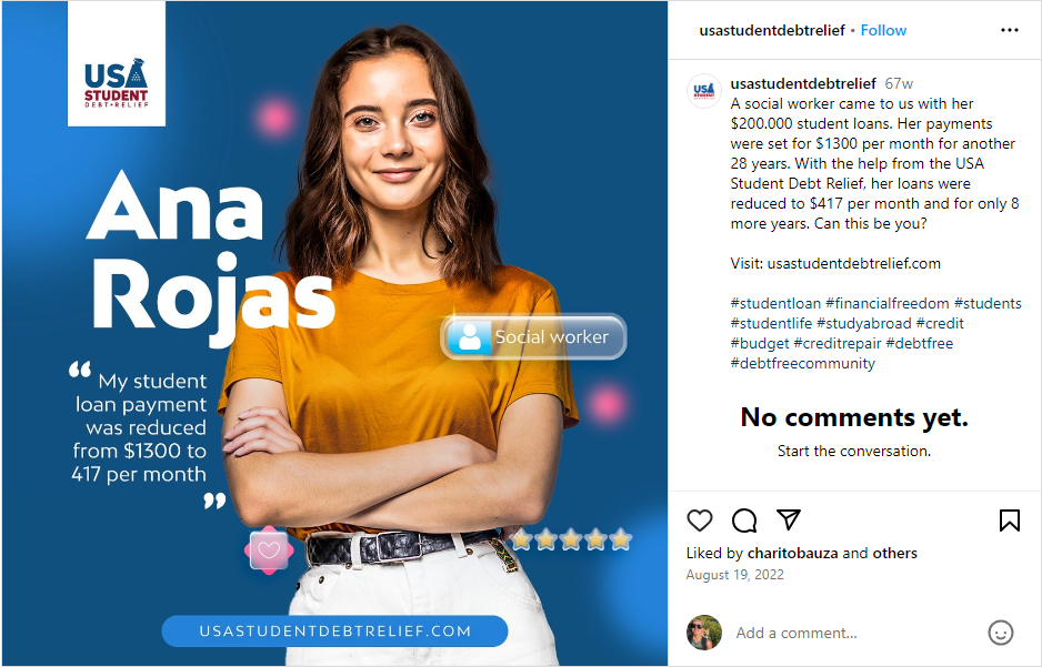 The complaint also notes that USASDR falsely marketed its services with fake testimonials and reviews on its website and social media pages, as well as on third-party consumer review platforms like those hosted by the Better Business Bureau and Trustpilot. For example, USASDR posted testimonials to its Instagram and Facebook pages that falsely appeared to recount real consumers’ positive experiences with the company. One such testimonial posted on August 19, 2022 purported to recount the experience of “Ana Rojas” and falsely claimed that USASDR had reduced her loan payments from $1,300 per month for 28 years to only $417 per month for eight 8 years.