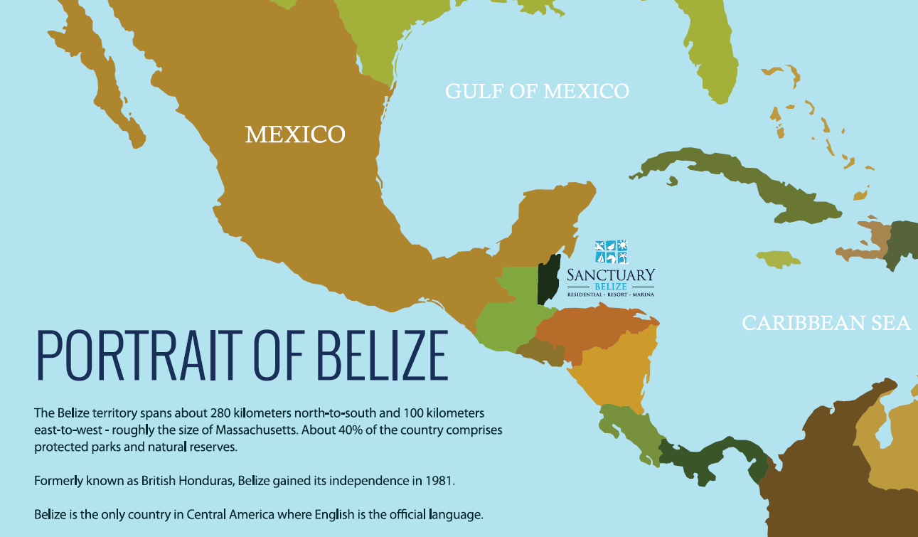 ![]() | Map showing the location of Belize in Central America. Belize is bordered by Mexico in the north and Guatemala to the east and south. | Sanctuary Belize sales material: Vision Book | |