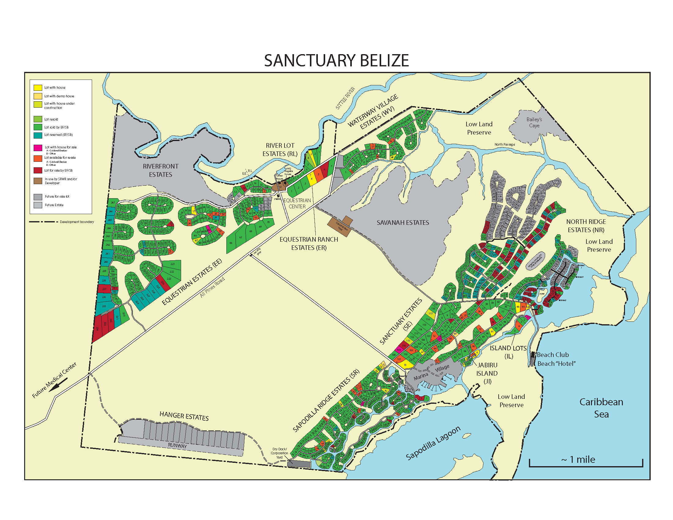![]() | Map from 2015 showing details of each lot’s status, e.g. whether the lot is sold, has been resold, has a house, has a house under construction. | Sanctuary Belize sales materials | |